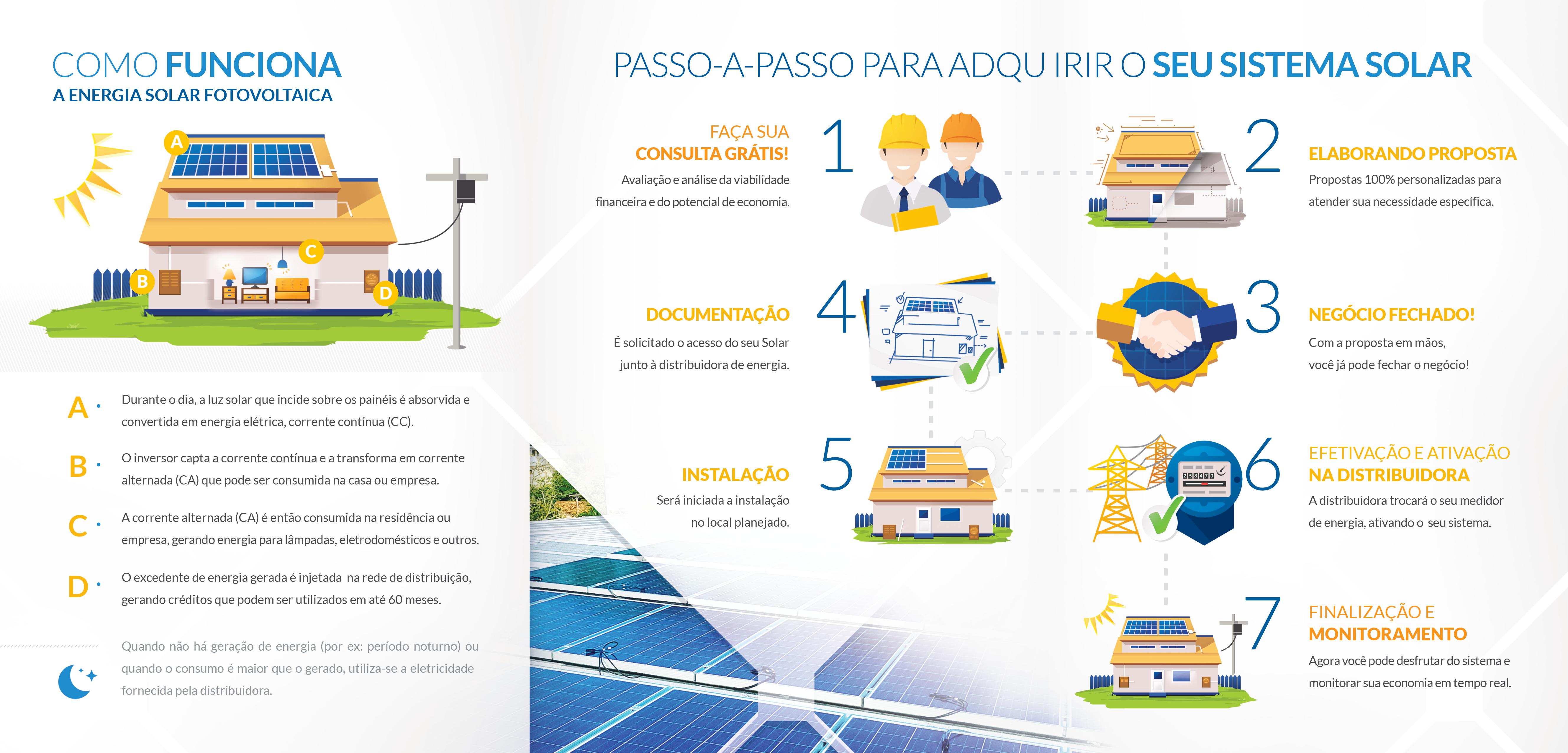 A energia solar fotovoltaica consiste na geração de energia elétrica por meio da captação da luz do sol. É uma solução limpa, renovável e ilimitada que permite a geração de eletricidade no próprio ponto de consumo. Esta tecnologia pode ser empregada tanto em áreas urbanas como em locais rurais e remotos.